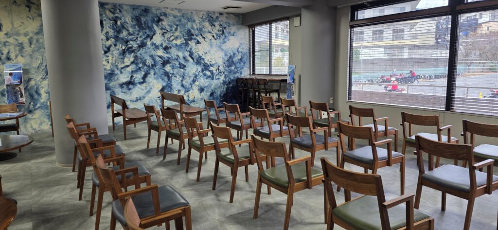 おしゃれな藍の壁が映えるロビーで、待ち時間もゆったり快適。教習の合間にほっと一息つける居心地のいい空間をご用意しております。
